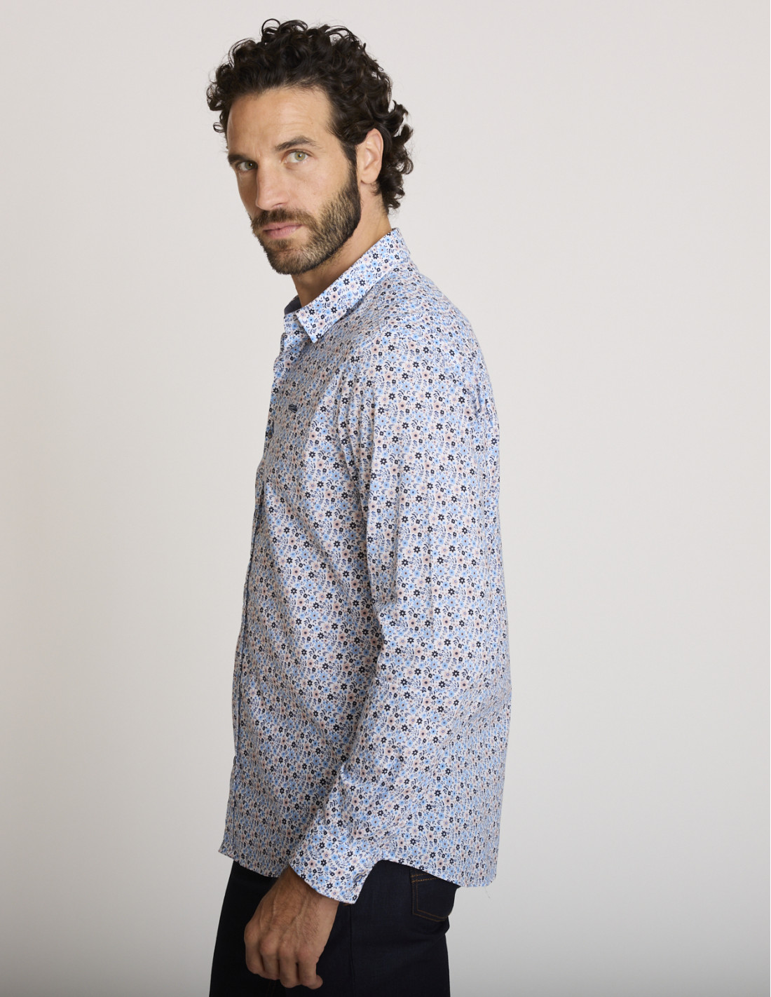La camisa para hombre CHECHIA azul espuma forma parte del universo Driver City de DELAHAYE, pensado para un estilo urbano elegante, inspirado en la cultura del automóvil. El estampado floral enriquece el conjunto con sutileza, con un espíritu a la vez sobrio y moderno.