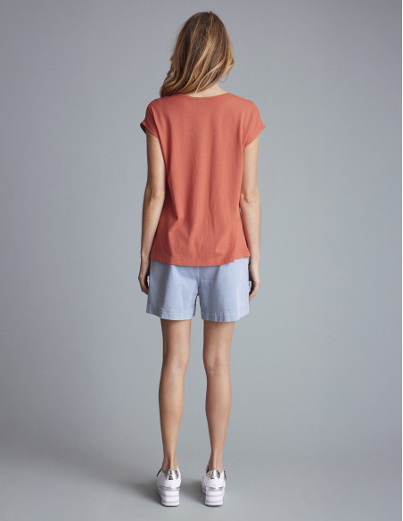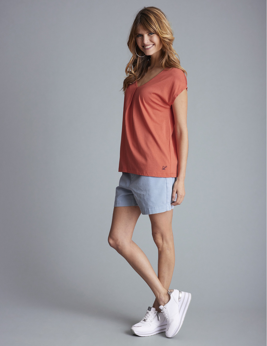 La camiseta LANSEPAMPIN es una prenda imprescindible en el armario femenino. Con su corte fluido y su elegante cuello en V, te acompañará con ligereza en tu día a día. Disponible en Lime, Braize y Green.