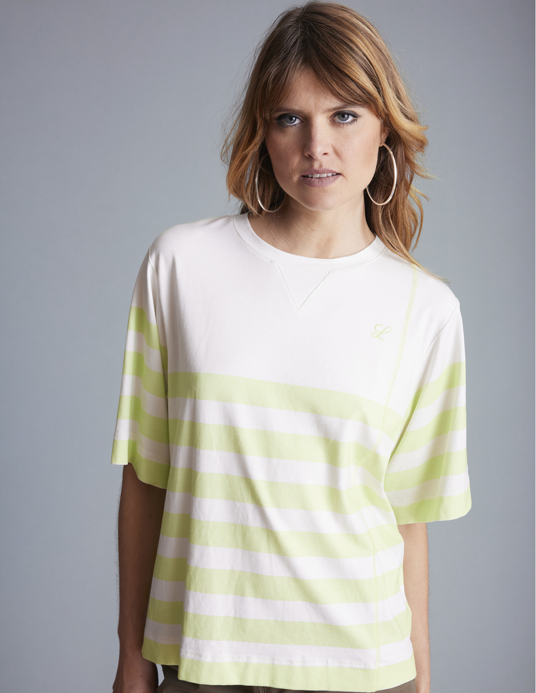 La camiseta LITTORAL es una prenda imprescindible en el armario femenino. Con su corte amplio y sus rayas lima, ofrece un estilo desenfadado y elegante a la vez. Ideal para un look informal con vaqueros o más elegante con una falda.