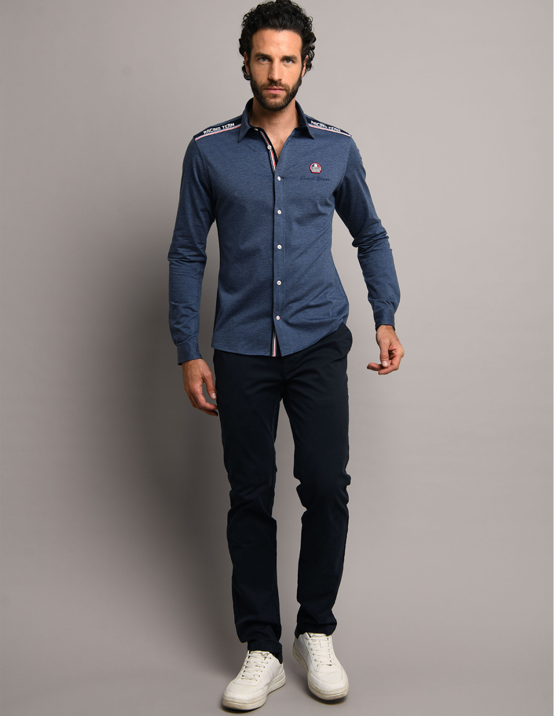 Découvrez la chemise Navy de DELAHAYE RACING, où l'élégance sportive rencontre un style urbain sophistiqué. Confectionnée dans un tissu raffiné, cette pièce affiche des détails audacieux et chics inspirés de l'univers des courses automobiles.