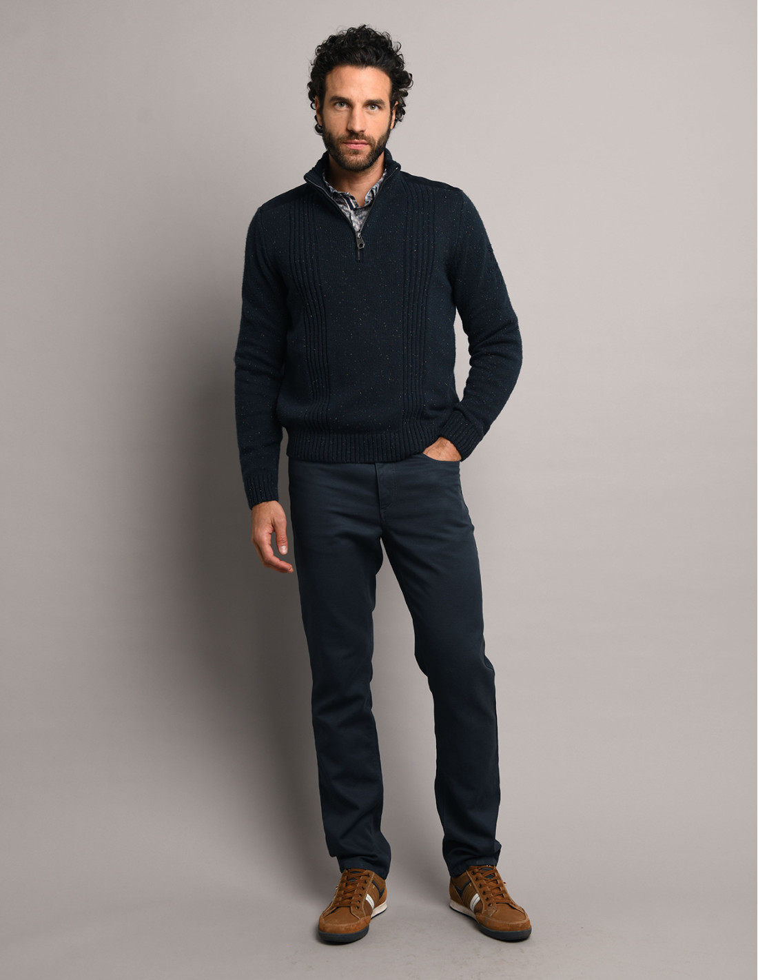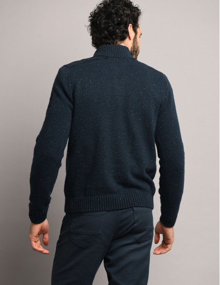 De lana lujosa y cálida, este jersey en color Nocturne encarna el espíritu Racing Vintage con una elegancia atemporal. Los detalles de acabado, como el cuello con cremallera, añaden un toque de sofisticación sutil pero impactante.