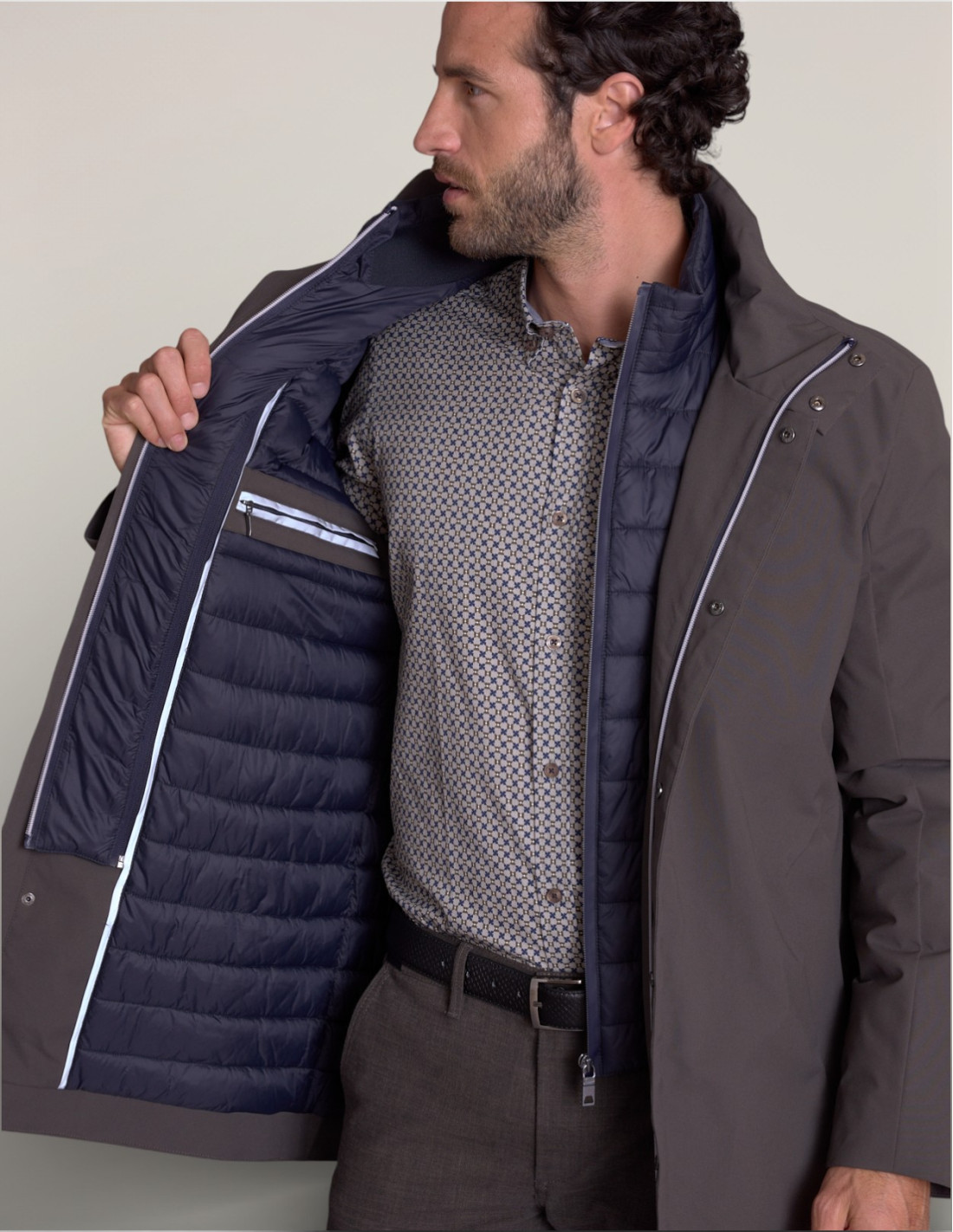 La veste KARELLIS écorce marie l'esprit urbain et l'élégance automobile moderne. Sa coupe longue et son design contemporain avec Sorona® en font une pièce signature pour un look urbain raffiné et distingué.