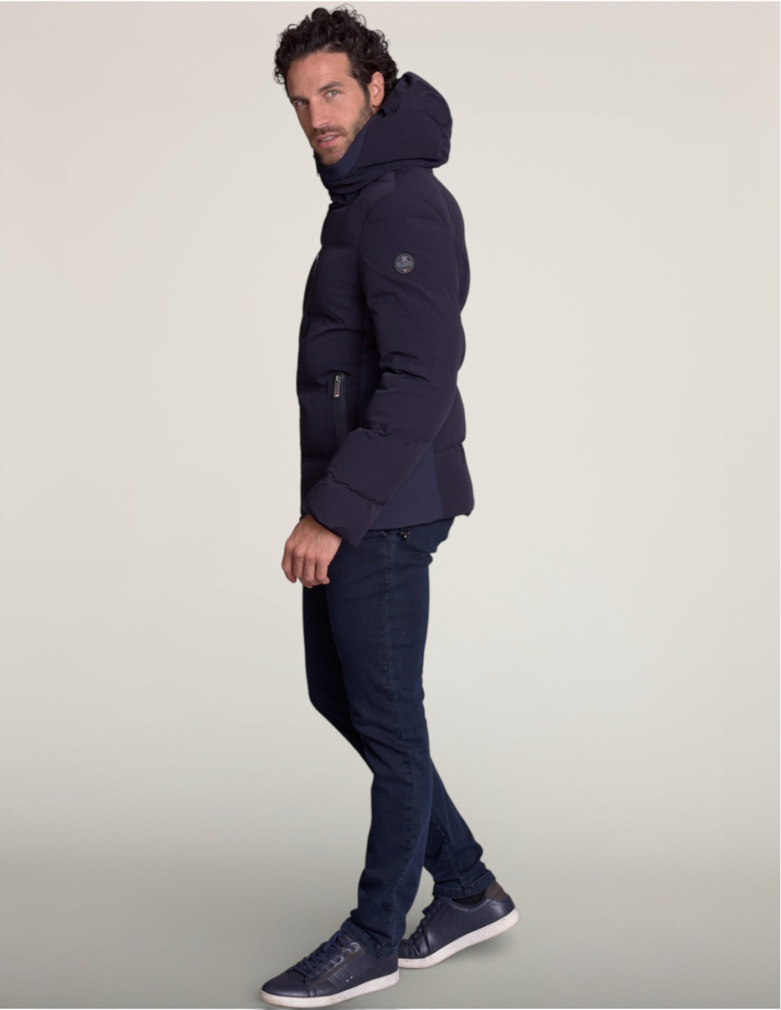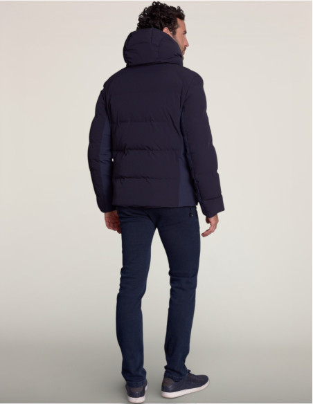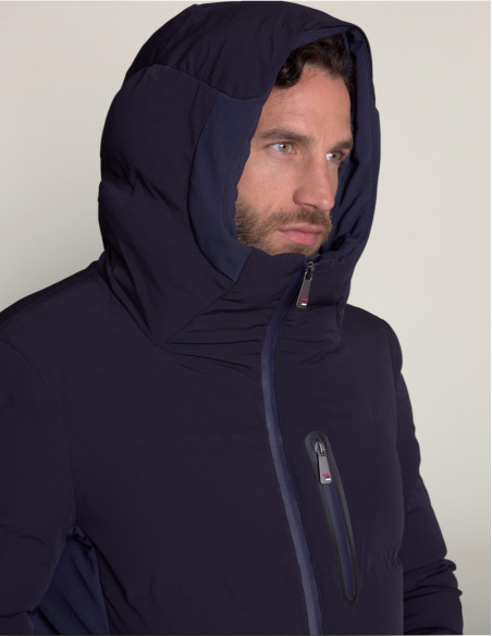 Le tissu stretch garantit confort et mobilité tandis que les fermetures éclair étanches protègent des intempéries. La capuche enveloppante à col montant offre une protection maximale contre le vent. Le matelassage horizontal assure une isolation thermique efficace sans alourdir la silhouette.