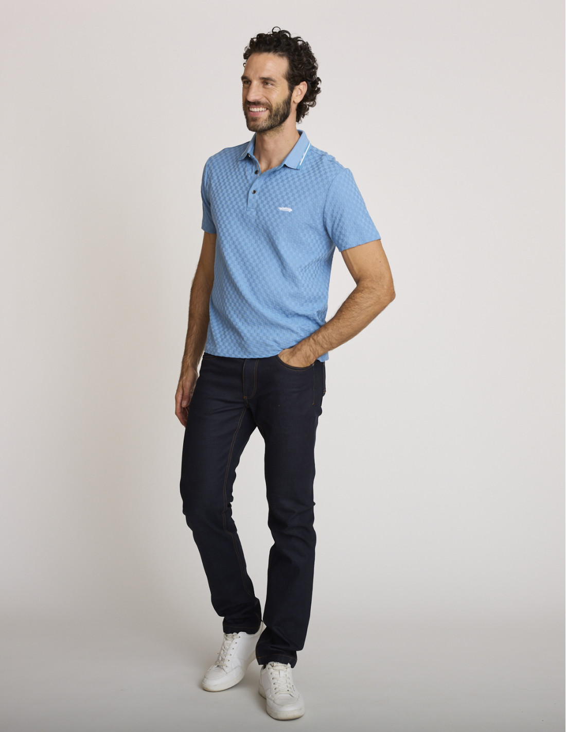 El polo LONOTIS azul celeste destaca por su discreto efecto damero, inspirado en el mundo del automóvil y la conducción urbana. Su tono fresco ilumina la silueta y combina naturalmente con unos vaqueros claros, unos pantalones blancos o unos chinos beige, para un estilo dinámico y moderno.