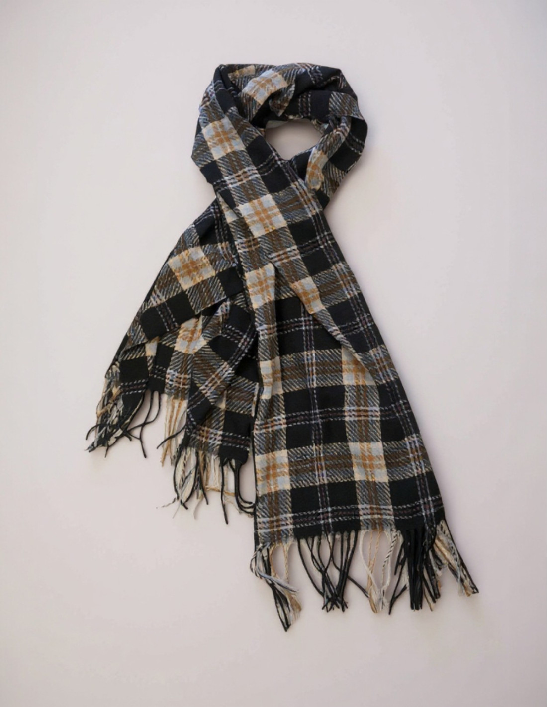 Le motif à carreaux associe le noir profond à des touches de camel et d'écru, créant un contraste élégant et intemporel. Les franges généreuses ajoutent une finition classique, tandis que le tissage structuré apporte du caractère à l'ensemble.