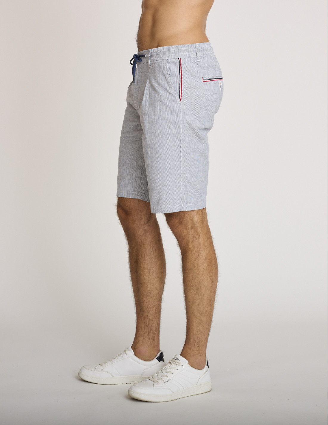 Un bermuda rayé bleu et blanc incontournable pour un look estival premium signé DELAHAYE.