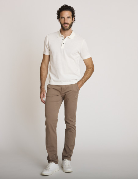 Le pantalon POGGIOLO DELAHAYE en coton stretch coloris seigle incarne un équilibre parfait entre élégance sobre et confort du quotidien. Sa coupe ajustée souligne la silhouette avec justesse, tout en restant agréable à porter grâce à sa matière légèrement extensible, idéale pour accompagner chaque mouvement.