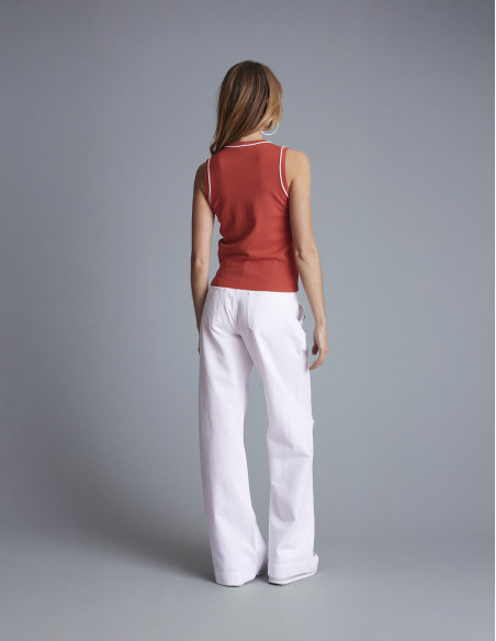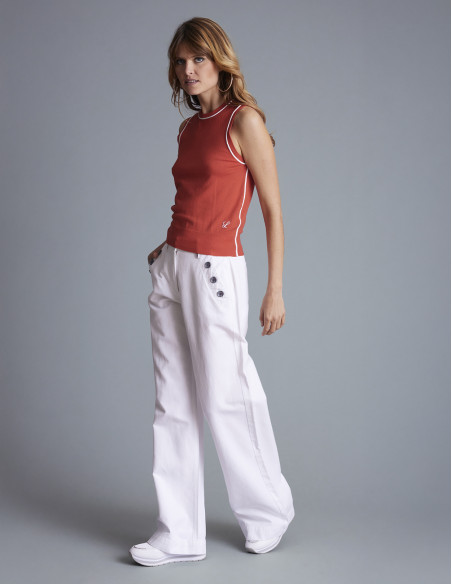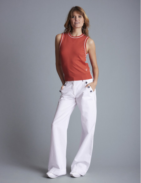 Le débardeur en maille TREMBLET, disponible en coloris braize et marine, est une pièce à l’élégance rétro-sport idéale pour dynamiser vos tenues estivales.