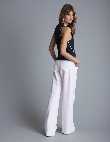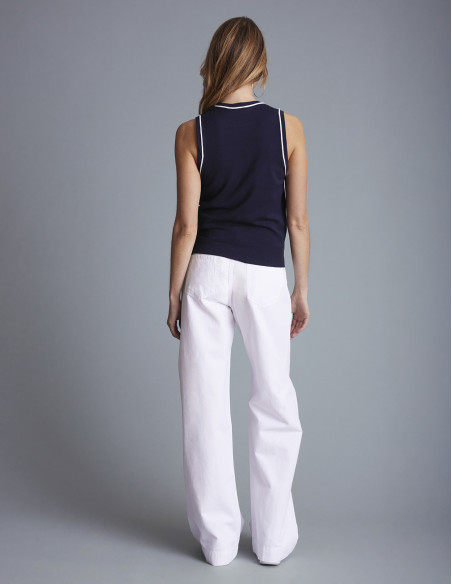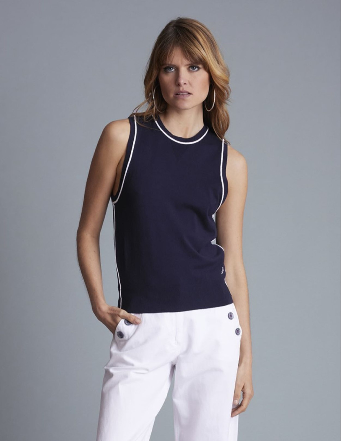 Le débardeur en maille TREMBLET, disponible en coloris braize et marine, est une pièce à l’élégance rétro-sport idéale pour dynamiser vos tenues estivales.