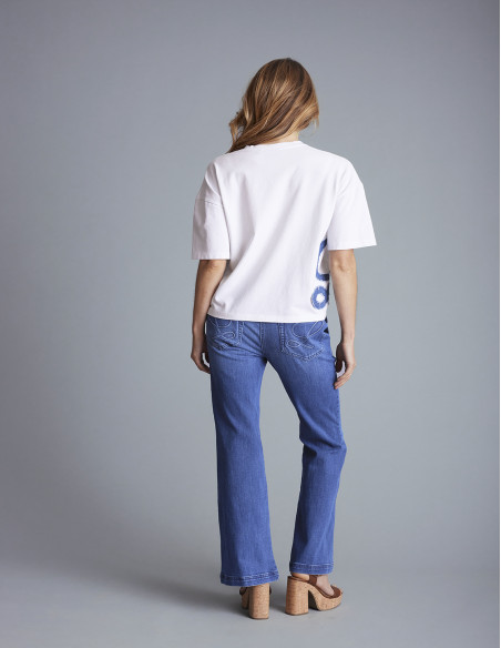 Le t-shirt LERMITAGE est une pièce tendance et audacieuse du vestiaire féminin. Avec sa coupe oversize et son inscription texturée, il allie confort et modernité pour un look à la fois décontracté et affirmé. Idéal avec un jean flare ou un short pour une allure chic et dynamique.