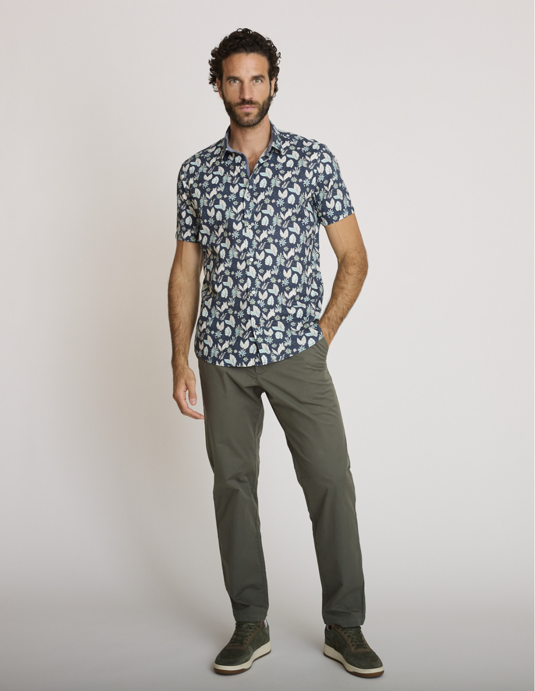 Questa camicia stampata da uomo si integra naturalmente in un outfit casual chic, con jeans o pantaloni chino. Il suo motivo vegetale aggiunge un tocco di personalità mantenendo un look curato, perfetto per le uscite in città, le vacanze o i momenti di relax.