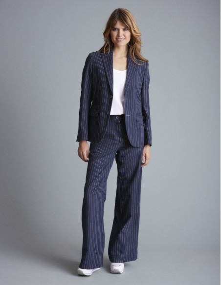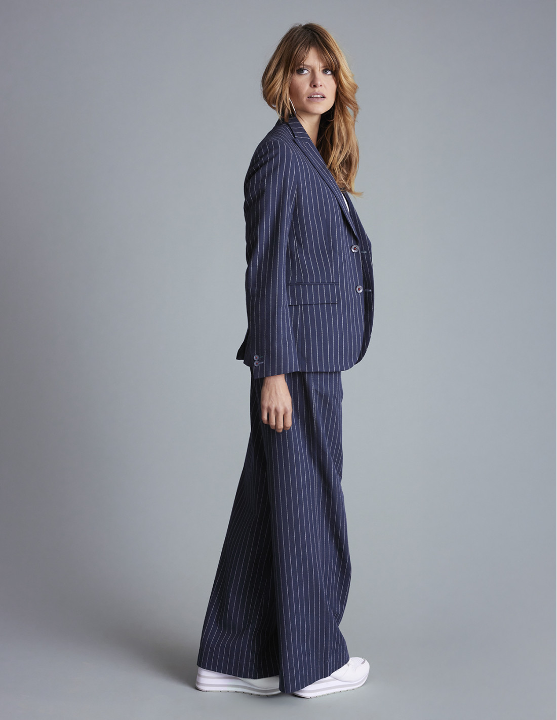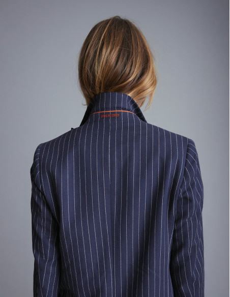 Il blazer VERRERIE dona un tocco di eleganza deciso con le sue sottili righe e i dettagli a contrasto, perfetto per un look chic e audace.