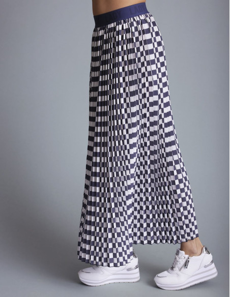 La gonna lunga a pieghe JAMOURO è un capo audace e alla moda. Con la sua stampa a scacchi e la cintura elasticizzata con logo, offre uno stile moderno e dinamico. Perfetta per un look sportivo chic.