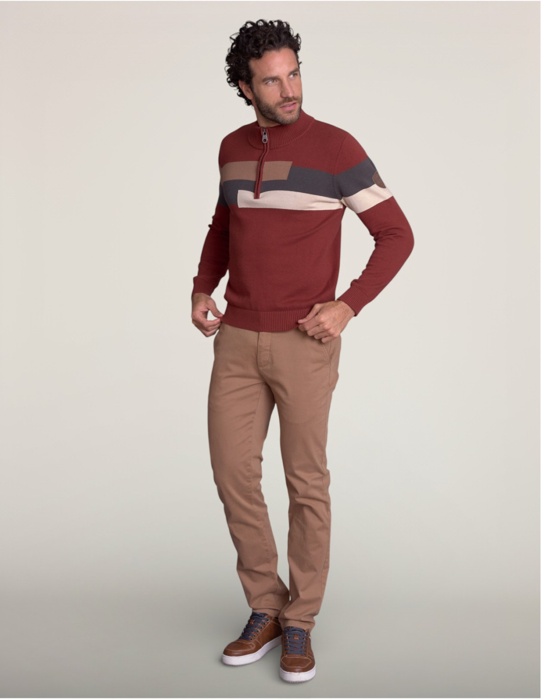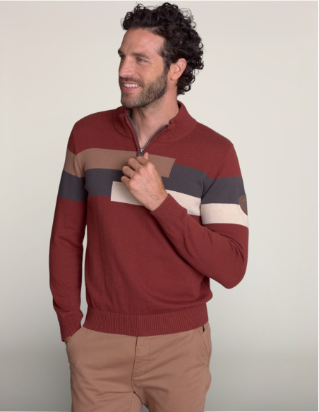 Le motif à rayures horizontales multicolores évoque les pulls de ski des années 70-80, signature de la collection Racing Vintage. Le coloris braise apporte une touche chaleureuse et affirmée, tandis que les bandes camel, anthracite et écru créent un contraste dynamique et sportif. Le col montant zippé offre une protection supplémentaire et une allure décontractée chic. L'écusson brodé sur le bras ajoute une touche d'authenticité vintage et de caractère.