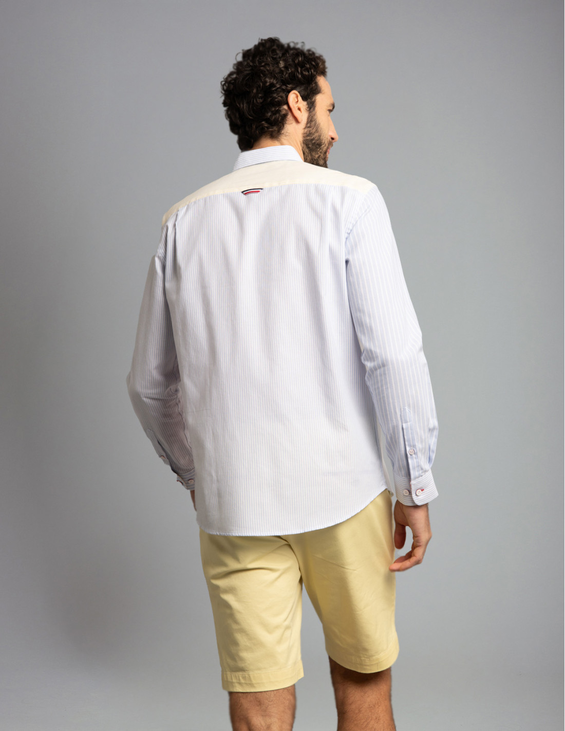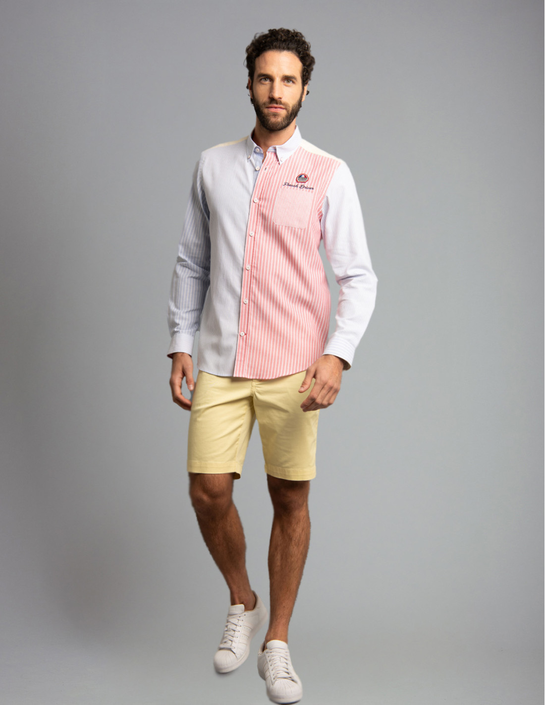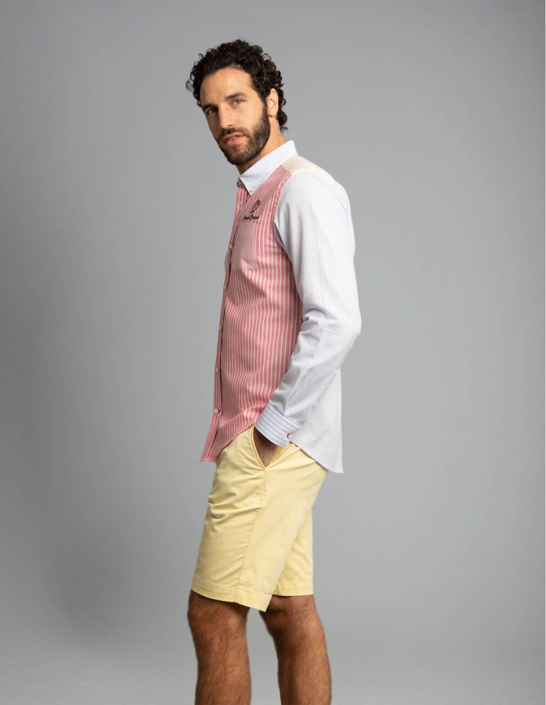 Affirmez votre style avec la chemise CAMARGUE, un modèle au design original inspiré de l’univers nautique. Son jeu d’imprimés à rayures asymétriques en bleu et rouge apporte une touche à la fois élégante et décontractée, idéale pour les amateurs de style raffiné.