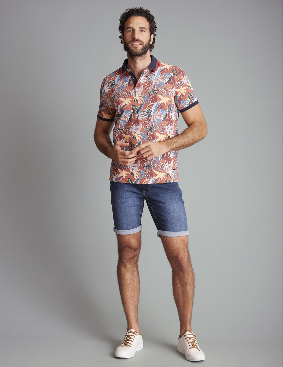 Portate l'estate nel vostro guardaroba con la polo LOLIVU. La sua stampa floreale dai toni esotici dona un tocco di vivacità ai vostri outfit estivi. La modella indossa una taglia L.
