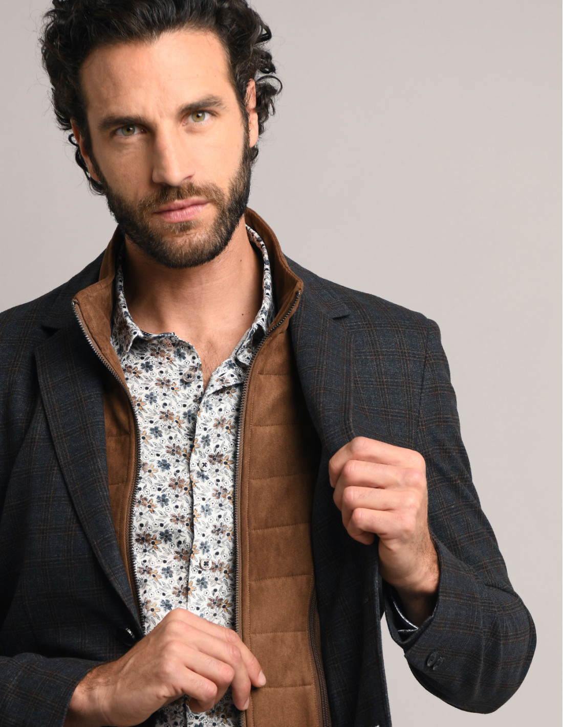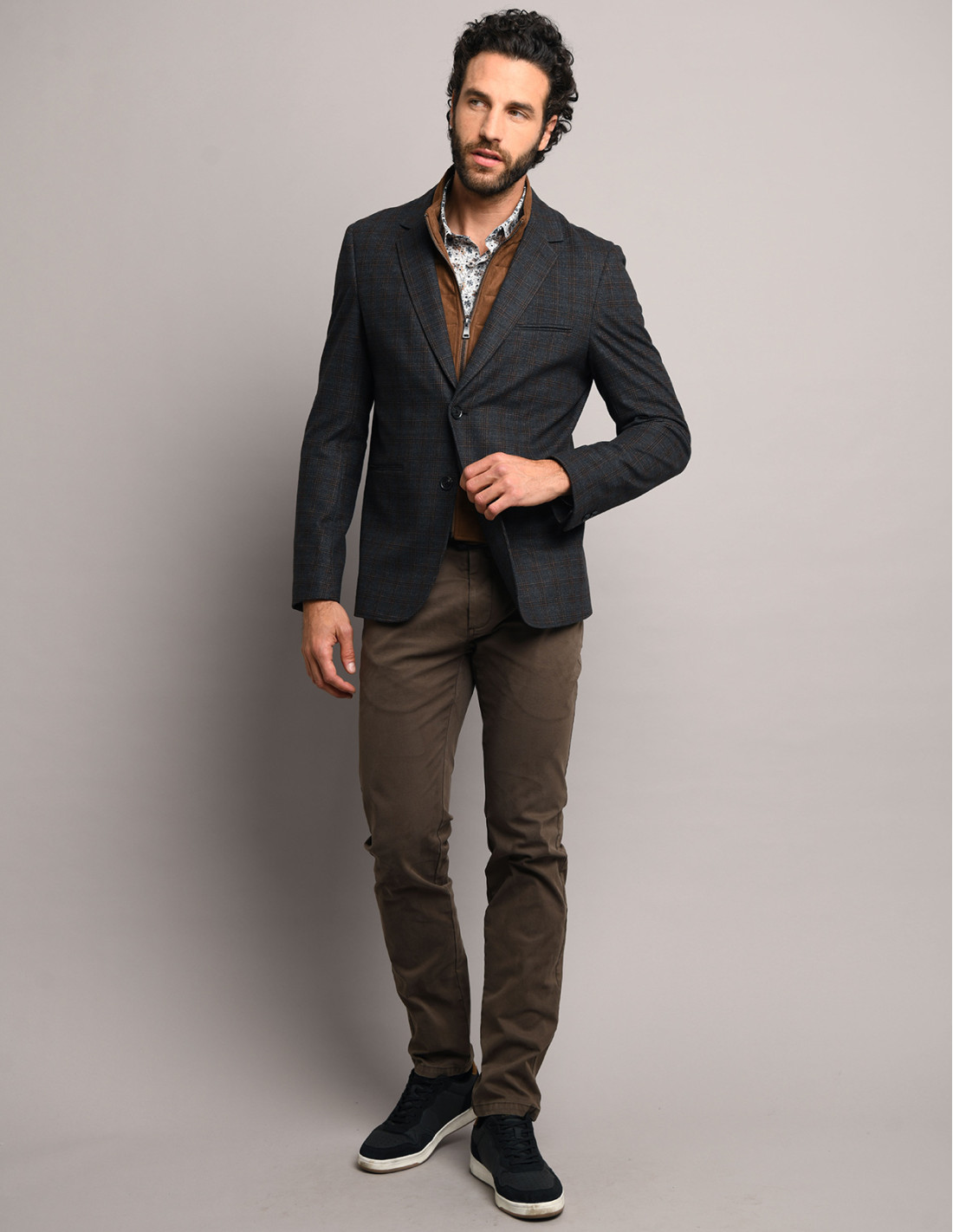 Associez-le avec un pantalon beige et une chemise à motifs pour un style élégant et intemporel.